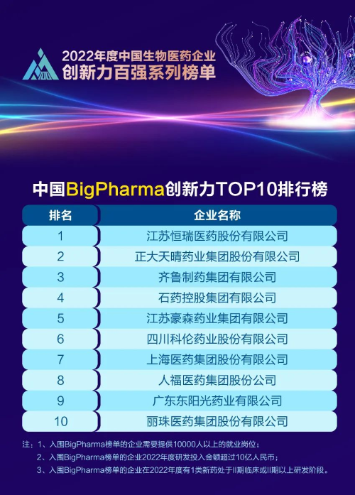 同日,2023米思会(中国医药健康产业共生大会)发布“2022年度中国生物医药企业创新力百强系列榜单”,PG医药再蝉联“中国BigPharma创新力TOP10”榜首。该榜单自2021年启动评选以来,PG医药稳居榜首。