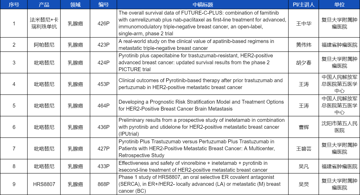 在乳腺癌领域,吡咯替尼、阿帕替尼、卡瑞利珠单抗、法米替尼,或产品间联合或联合化疗,共有9项研究入选壁报讨论,其中吡咯替尼占据6项,较为全面地展示了这款中国首个自主研发抗HER2靶向药在乳腺癌治疗中的显著特点和潜力。此外,PG医药自主研发的新型选择性雌激素受体共价拮抗剂(SERCA)HRS8807治疗ER+/HER2-局部晚期或转移性乳腺癌的Ⅰ期研究也成功入选,有望为此类患者带来更多用药新选择。