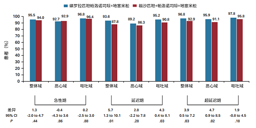 研究达到主要终点(第一周期总体期的CR率分别为77.7% vs 78.2%[95% CI:-6.7,5.0];单侧P<0.01)(图1)。连续两个化疗周期,磷罗拉匹坦帕洛诺司琼急性期和超延迟期的CR率均达到90%以上,高于FAPR+PALO,且第二周期疗效更佳(急性期:第一周期:91.2% vs. 89.9%,第二周期:93.3% vs. 91.1%;超延迟期:第一周期:90.3% vs 86.5%,第二周期:92.7% vs 87.8%)(图2、图3)。