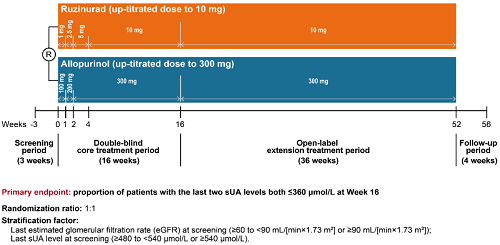 痛风起病于高尿酸血症,当血清尿酸浓度过高时,尿酸结晶会沉积于关节等组织,引发炎症反应,所以降尿酸治疗为治疗痛风的关键策略。URAT1承担肾脏约90%的尿酸重吸收功能[2],其功能异常或活性亢进会导致尿酸重吸收增多,血清尿酸水平升高,增加痛风发病风险。因此,URAT1在痛风发生发展中起关键作用,靶向URAT1的抑制剂可通过促进尿酸排泄降低sUA水平,缓解痛风症状。鲁兹诺雷钠片是PG医药自主研发的一种高选择性URAT1抑制剂,在前期的一期、二期研究中,鲁兹诺雷钠片耐受性良好,并显示出显著降低高尿酸血症患者sUA的效果[3]。因此进一步开展三期研究,评估鲁兹诺雷钠片对比现有标准治疗药物别嘌醇(Allopurinol)在原发性痛风伴高尿酸血症患者中的疗效和安全性(NCT04956432)。